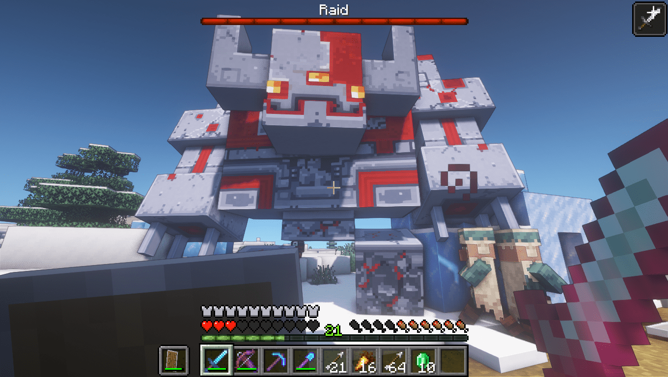 It looks like a giant stone devil with 3 herobrine eyes and 2 stone horns. . It is bright red (or the color of a.